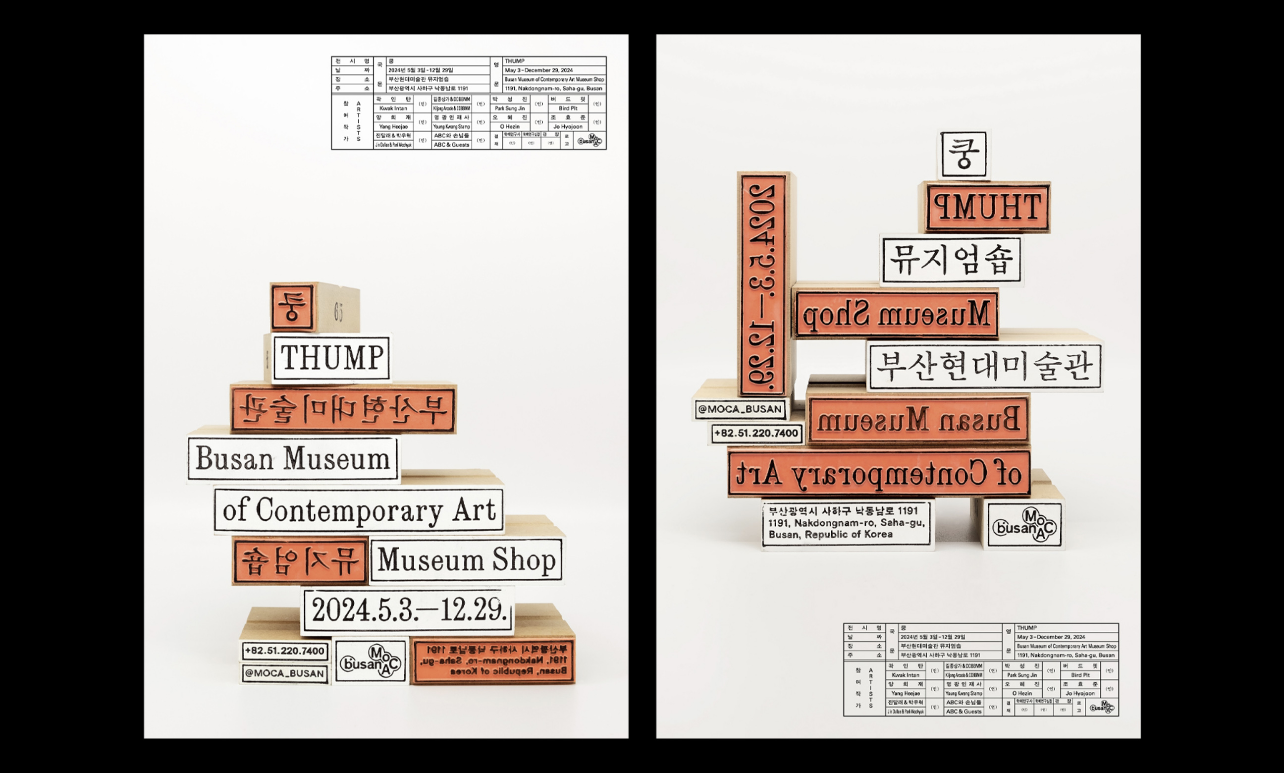 부산현대미술관에서 열린 전시 «쿵(THUMP)»을 소개하고 싶어요. 공동 기획자이면서 작가로도 참여했고, 전시의 그래픽 디자인도 맡았습니다. 규모가 크진 않았지만 다양한 포지션으로 참여하다 보니 지금껏 해 온 일 중에 가장 바빴던 것 같아요.
