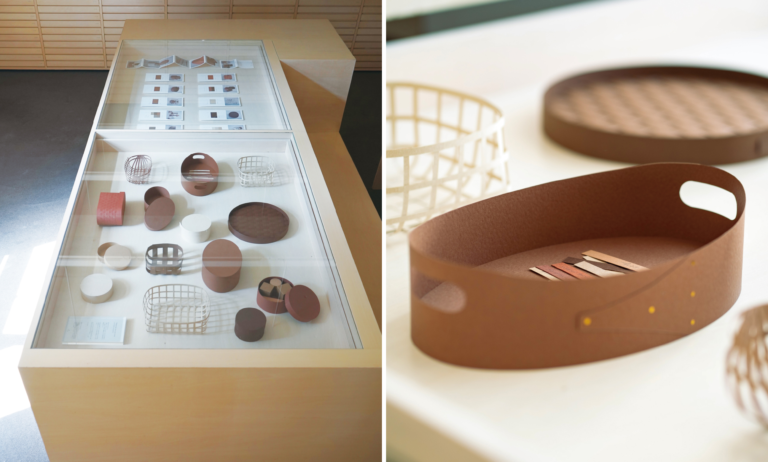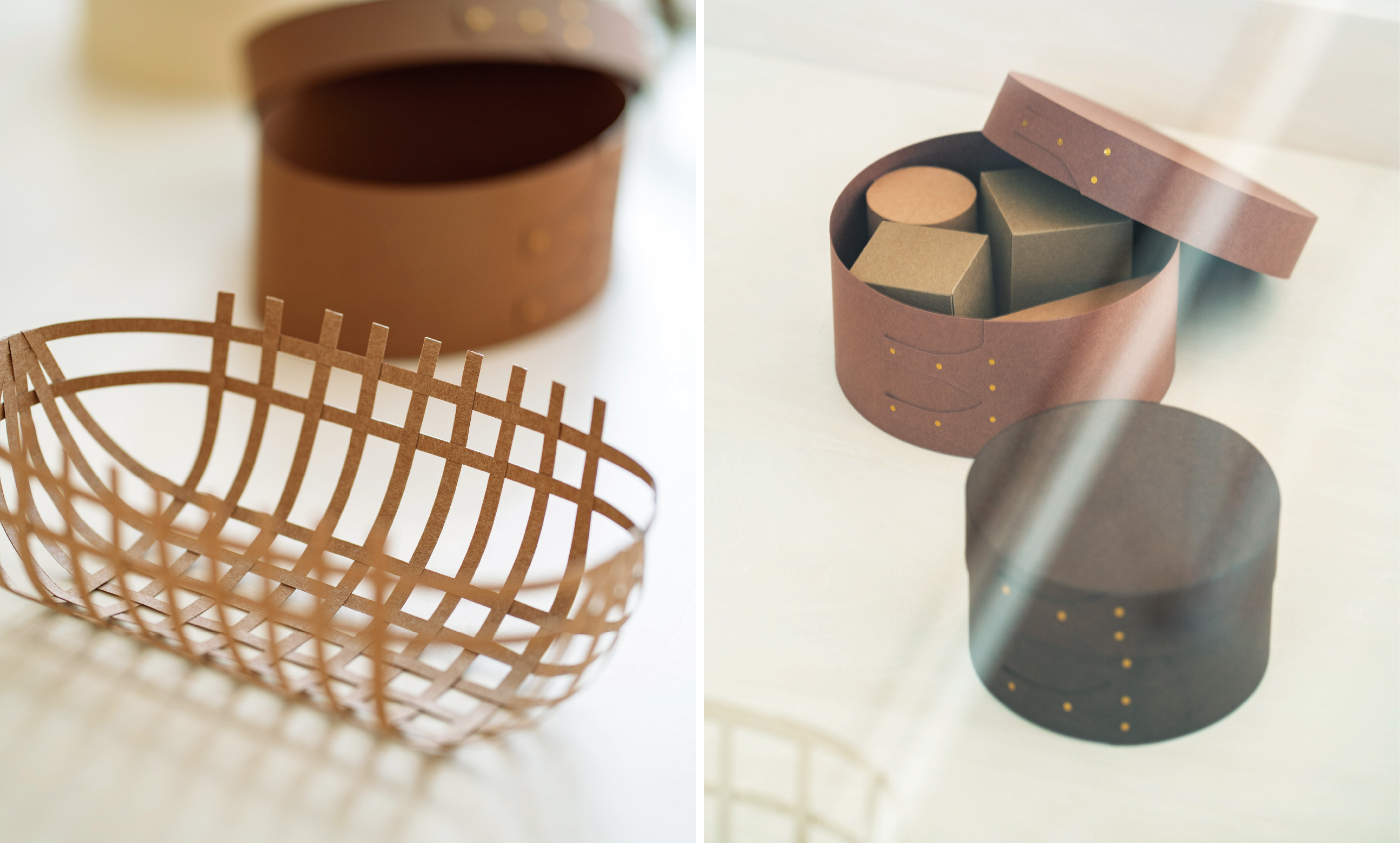 一見すると見慣れたこの木箱や籠は、よく見ると紙製で、シャープかつ軽やかな、紙ならではの表情が現れています。