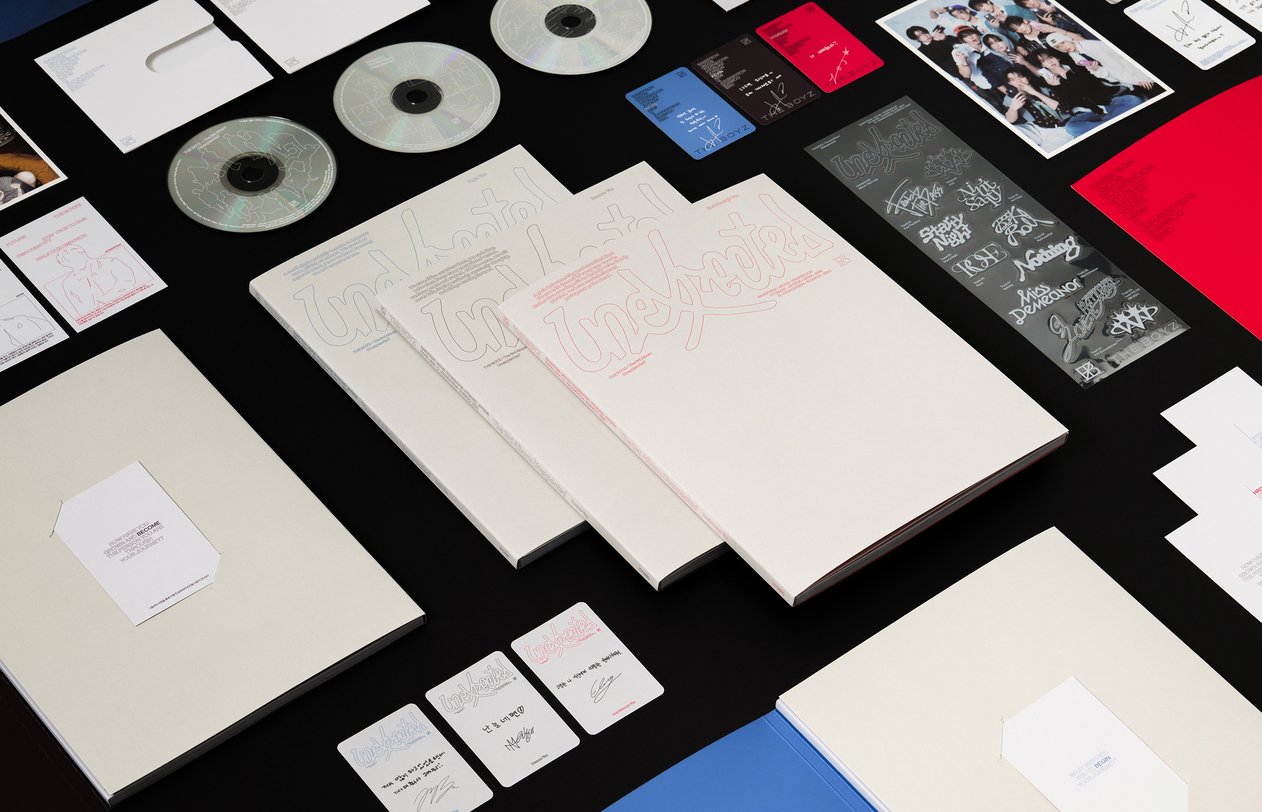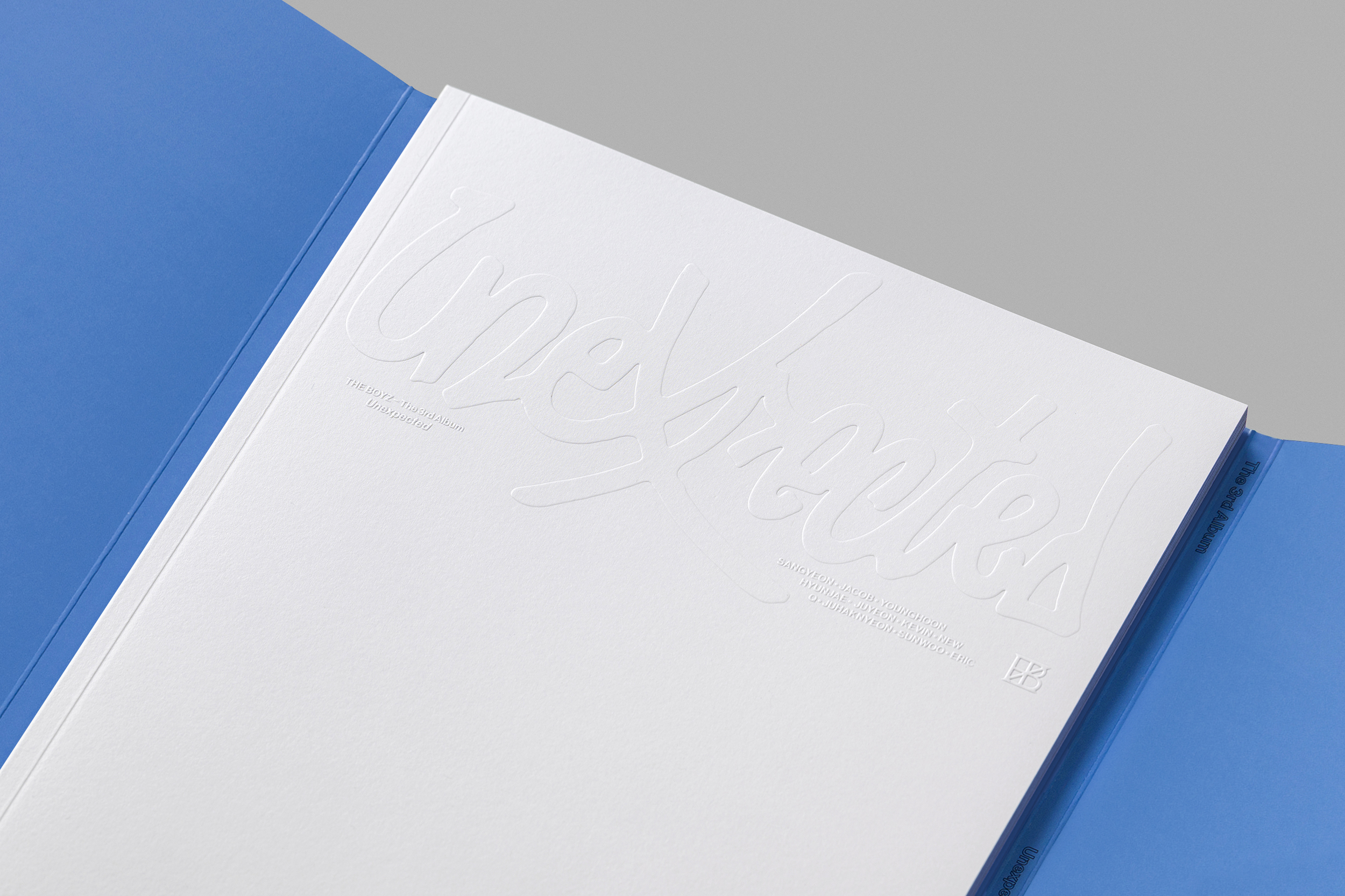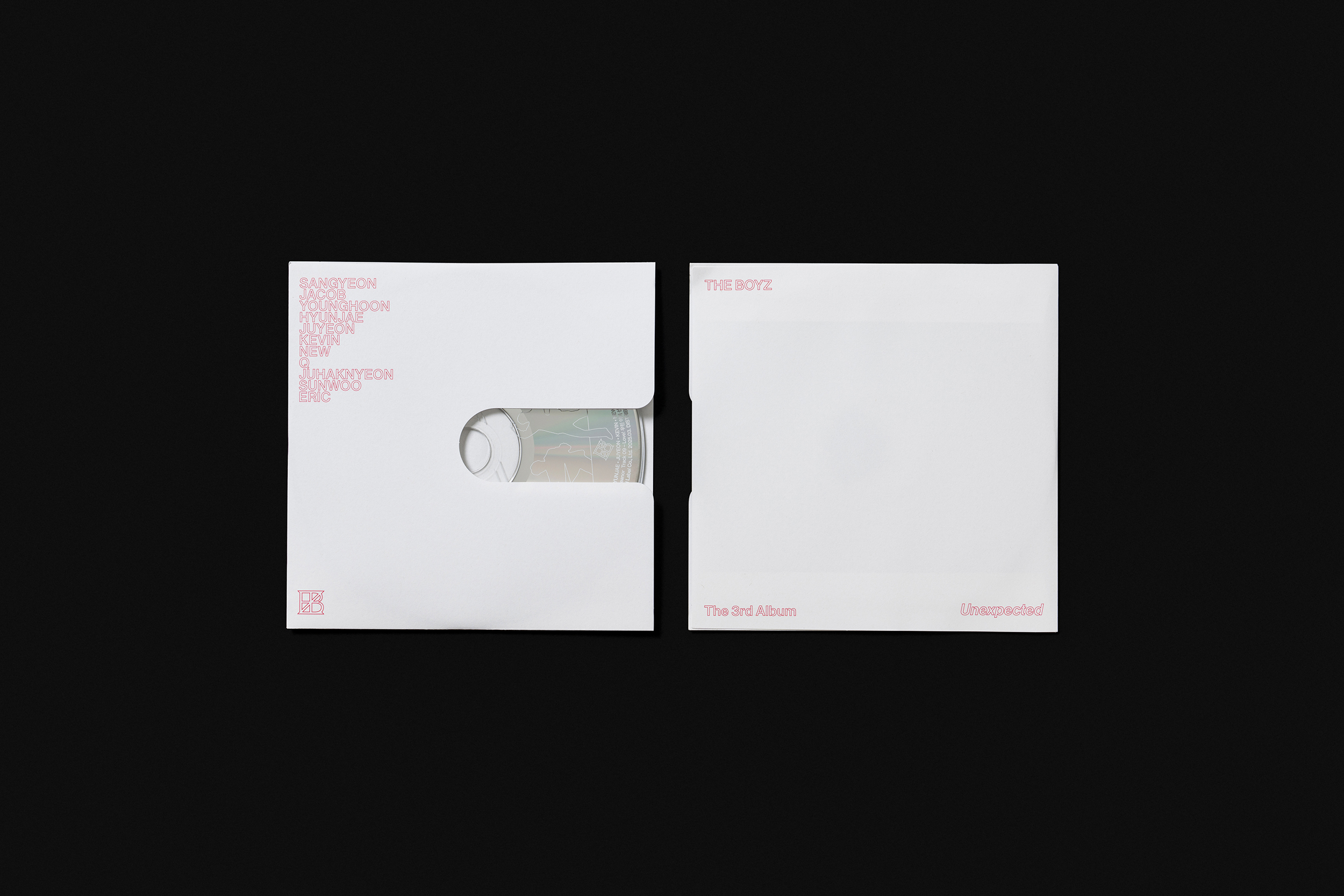 더보이즈는 K-POP 보이 그룹으로, 우리와 프로젝트를 시작하는 시점에 원헌드레드 레이블로 소속을 옮겨 새로운 시작을 준비하는 상황이었습니다. 그렇기 때문에 앞으로 이 보이그룹이 어떤 새로운 모습을 보여줘야 하는지에 대한 논의가 앞섰습니다. 더보이즈의 정규 3집 ‘Unexpected’는 ‘Fluid State’라는 비주얼 콘셉트를 바탕으로, 비워낸 상태에서 비롯되는 가능성과 변화의 서사를 담아내는 앨범입니다. 아티스트 본연의 모습을 중심에 두고, 고정된 이미지 없이 유연하게 변화할 수 있는 상태를 그래픽 아이덴티티 전반에 반영했습니다. 유연한 획으로 구성된 앨범 타이틀은 자유롭고 거침없는 태도를, 글자들이 서로 자연스럽게 스며드는 조형은 멤버 간의 결속을 , 투명한 타이포그래피 표현은 비워낸 상태이자 동시에 어떤 형태든 담아낼 수 있는 가능성을 표현합니다.