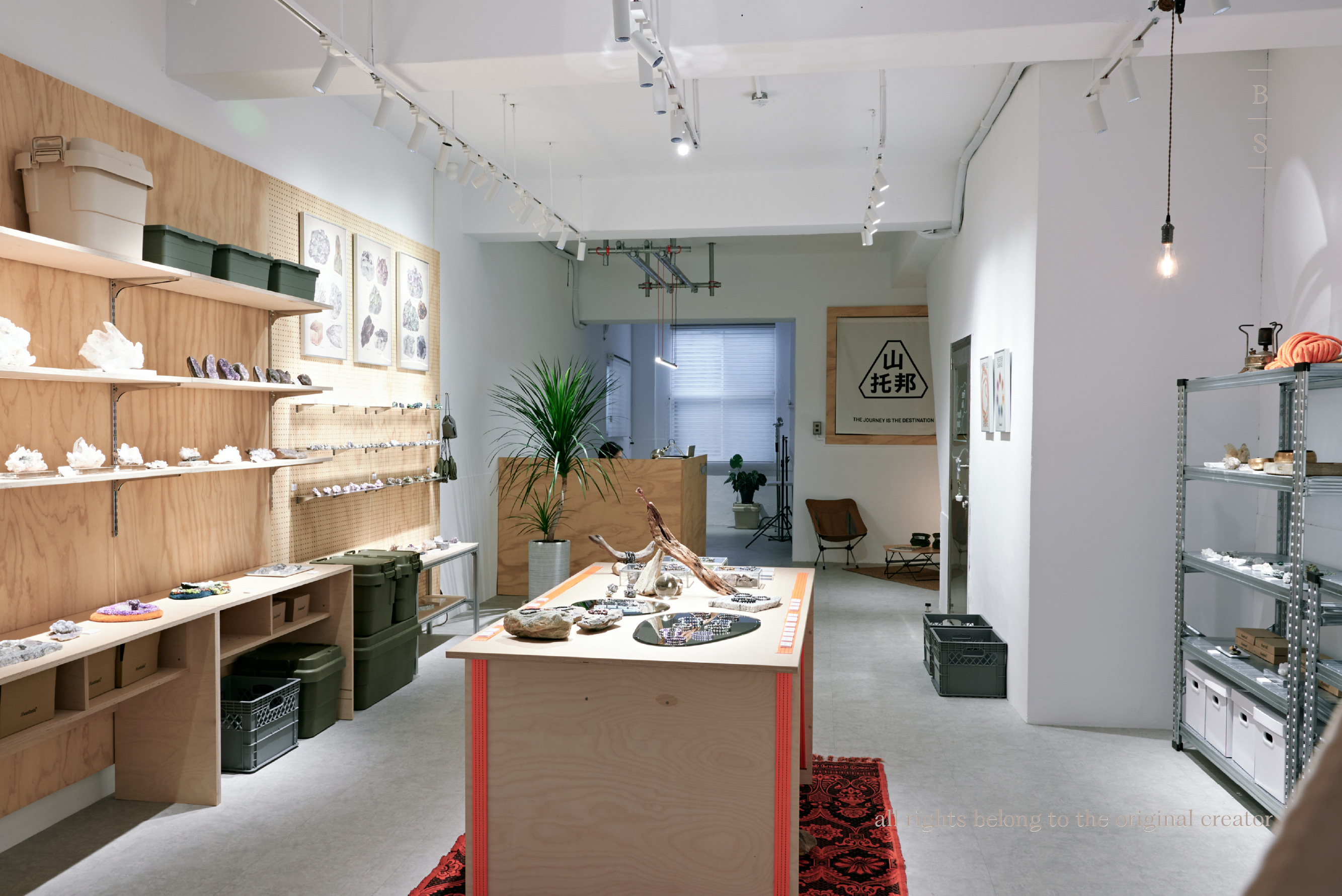 「山托邦」這個名字,來自 Mountain(山)與 Utopia(烏托邦)的結合,我們希望把自己真正喜愛的事物,慢慢融合成品牌的樣子。店面位在台北市大安區一棟老公寓的三樓,走進來前,必須先穿過一段小小的樓梯間再往上爬,連樓梯間的指示牌都很低調,讓人聯想到登山途中不經意出現的路標。當初在尋找空間時,意外發現這段爬樓梯的過程,剛好營造出登山後微微喘氣的感覺,抵達店裡時,也像是走進一間山屋,可以放鬆走進山托邦的礦石飾品世界。
